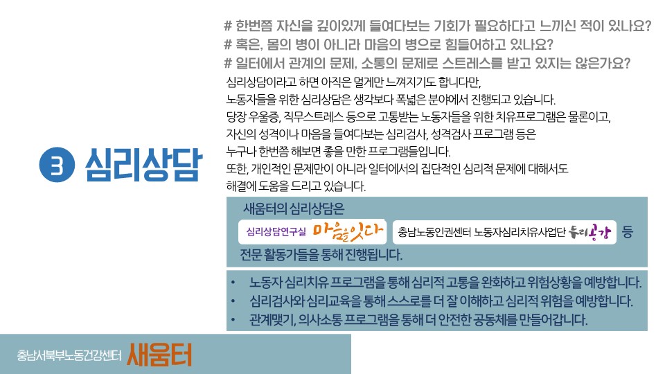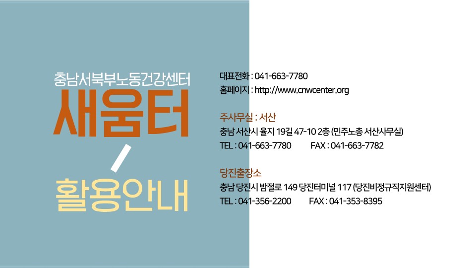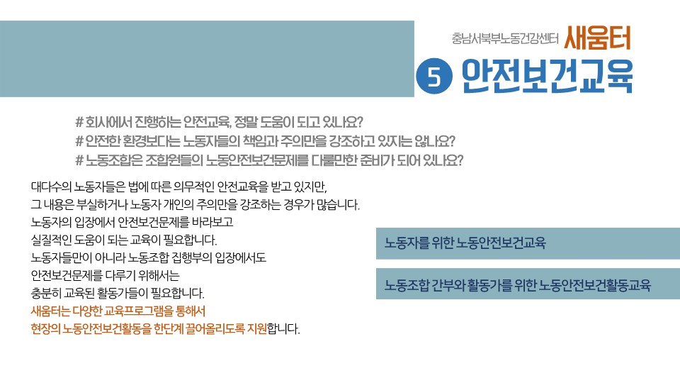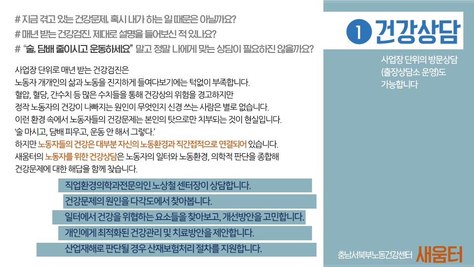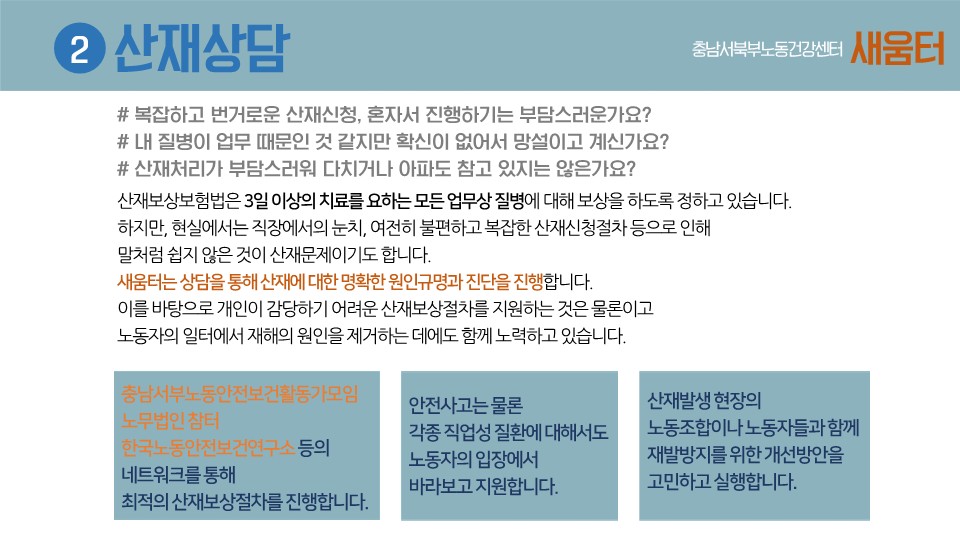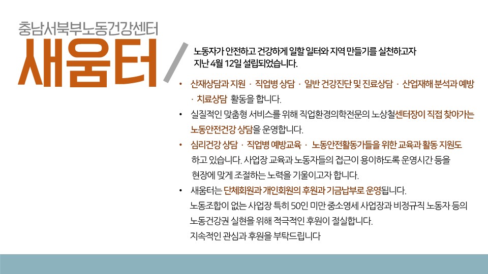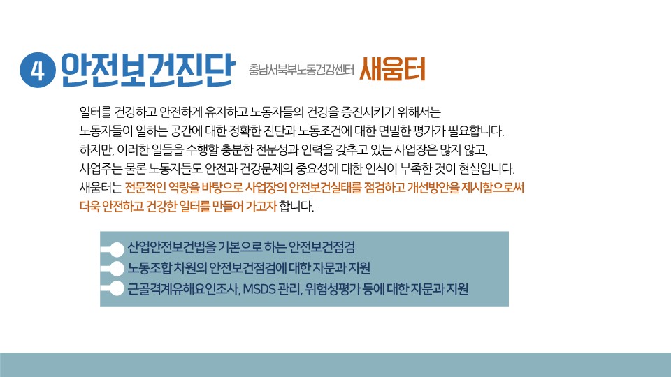 새움터의 노동안전보건서비스에 대해 상세히 설명된 자료입니다.