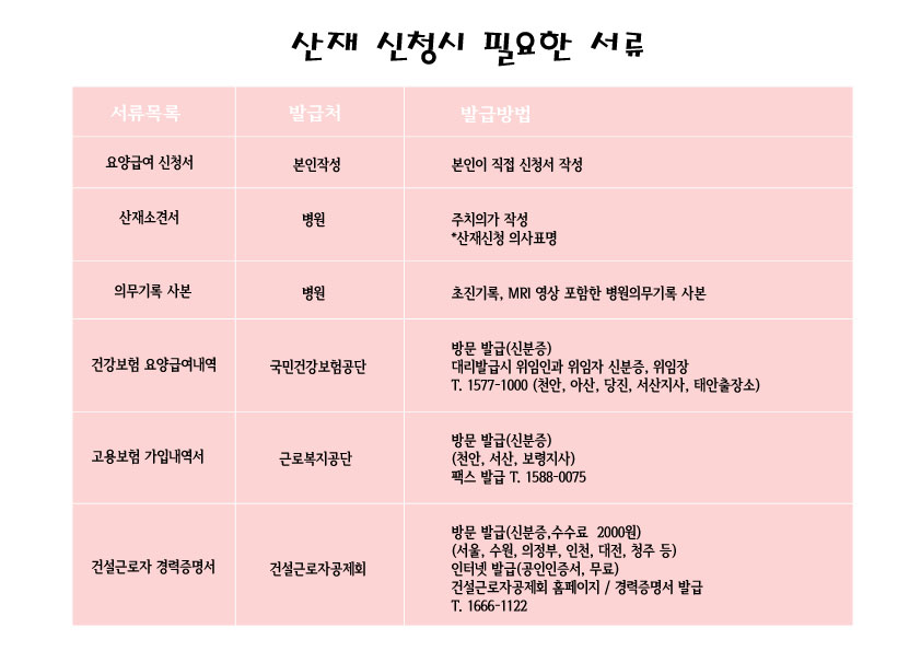 업무상 질병으로 산재신청시 필요한 서류목록과 발급방법 안내입니다.