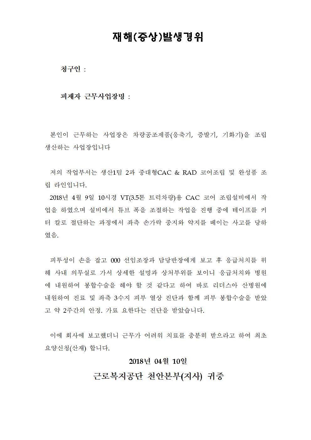 상 병 명 : 좌측 3수지 피부 열상