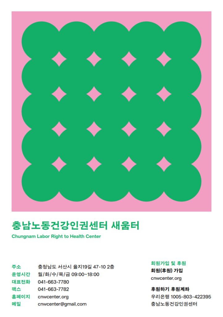 충남지역에서 활동학고 있는 노동단체들의 연대체 '충남노동단체네트워크'를 소개하는 책자입니다. 새움터를 비롯한 다양한 단체들의 활동을 살펴보실 수 있고, 공동활동에 대한 고민, 후원도 하실 수 있습니다. 노동단체네트워크소개책자_내지-1다운로드 노동단체네트워크소개책자_카드다운로드